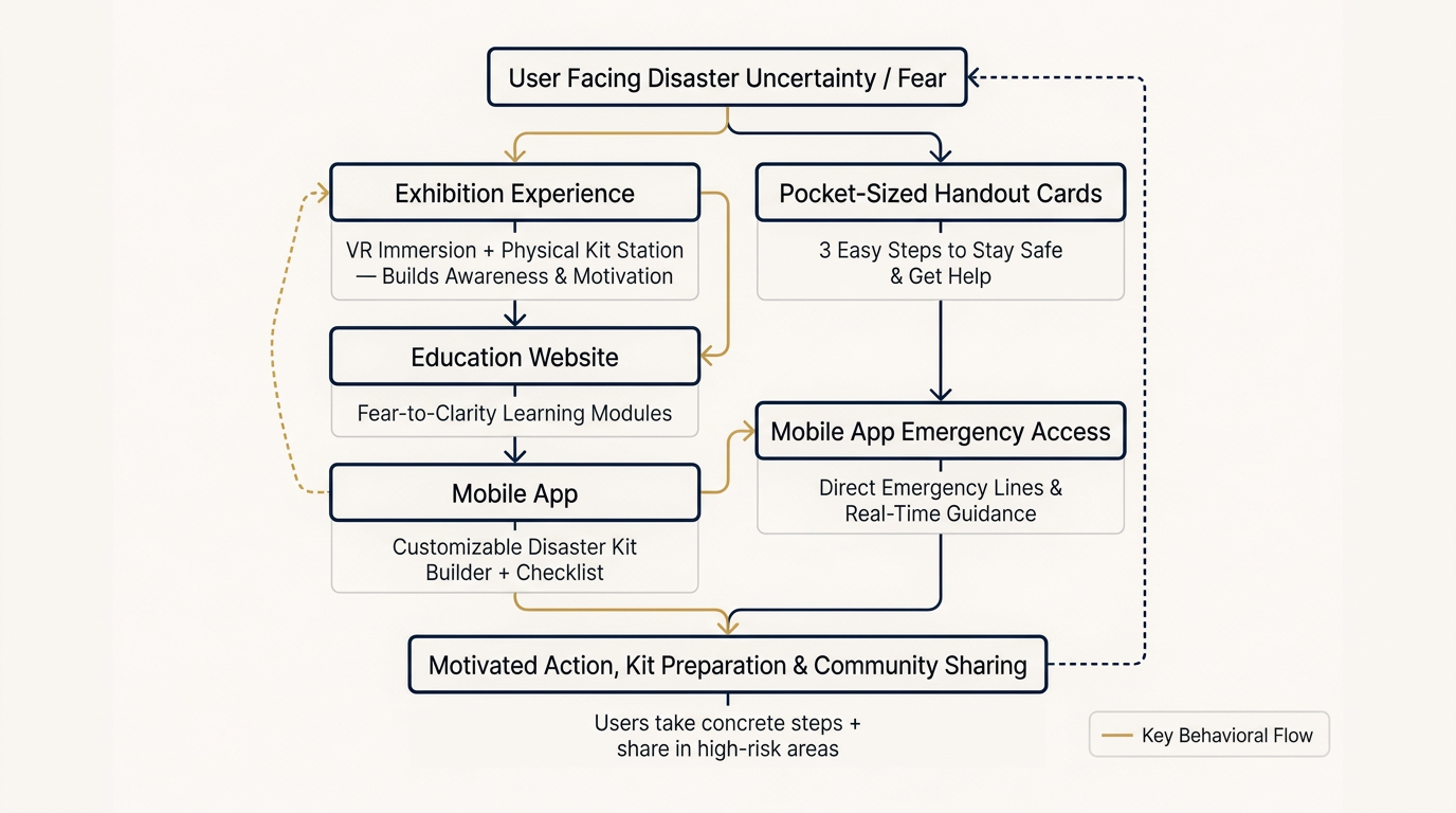 Project: The project combines an educational website, mobile kit-planning app, immersive VR + physical exhibition, and take-home pocket cards into a cohesive system that addresses both prevention and responsive needs.