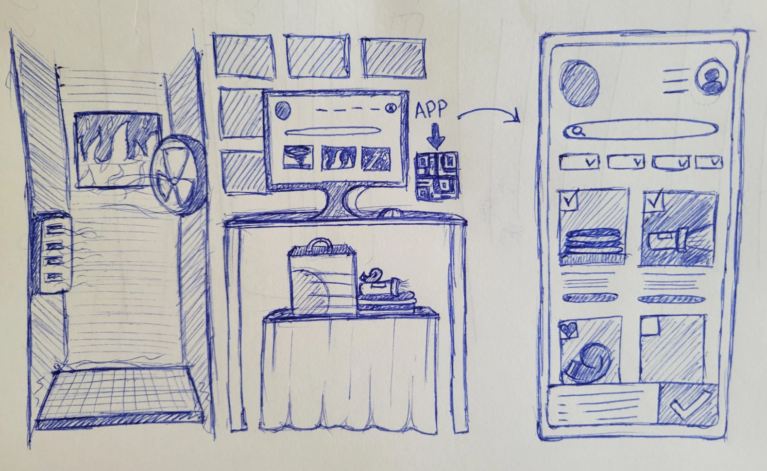 Early conceptual sketch of the immersive exhibition setup (showing integration of VR, physical kit station, and mobile app tie-in):