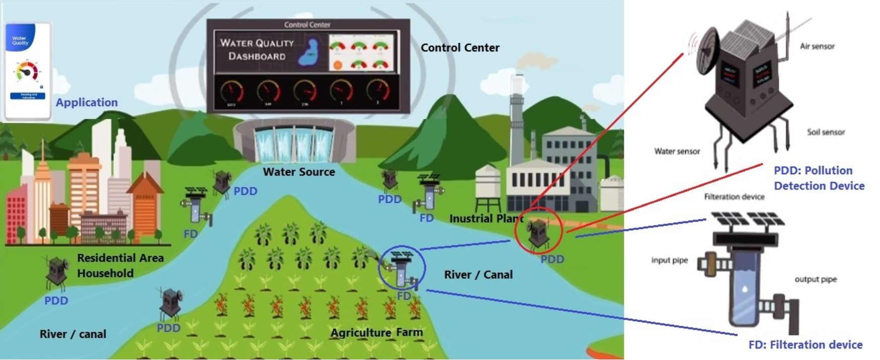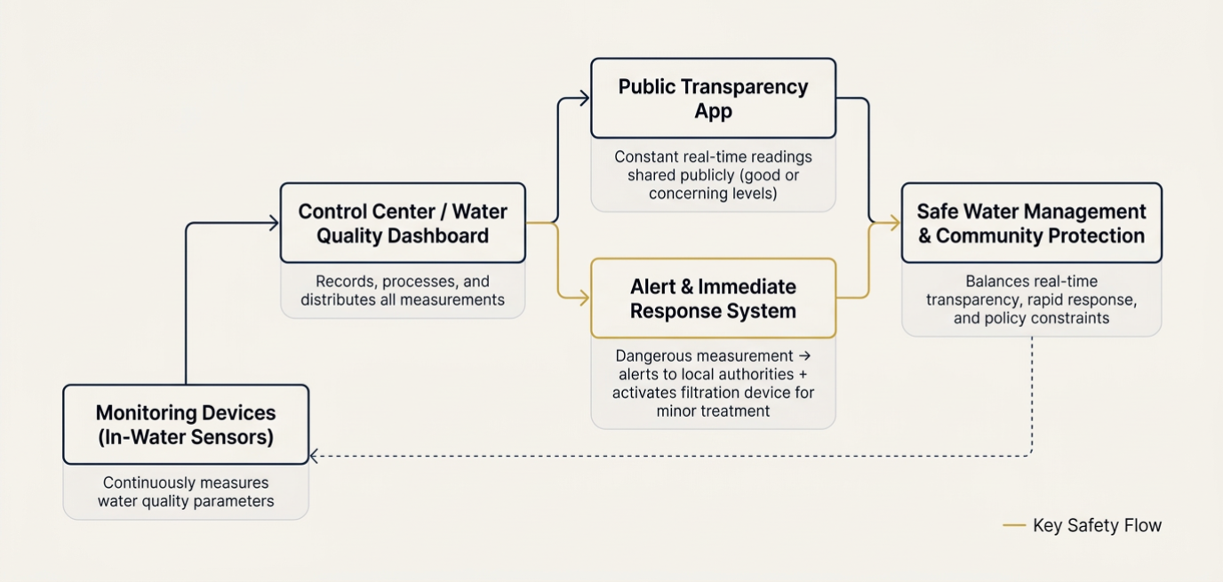 - Public Transparency App + Safe Water Management (FD) delivers constant real-time readings to the public (good or concerning) and activates immediate filtration response for dangerous levels