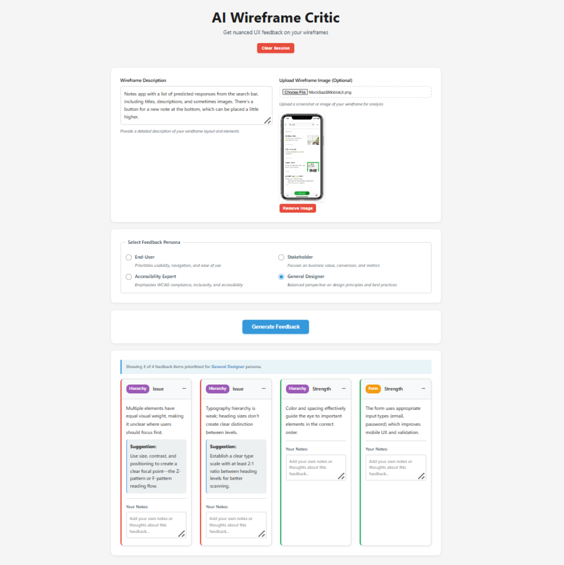 This product is currently called the "Wireframe Critic" (it's a working name), and the aim is to solve a real pain point: getting meaningful UX feedback early when real user testing isn't feasible yet.