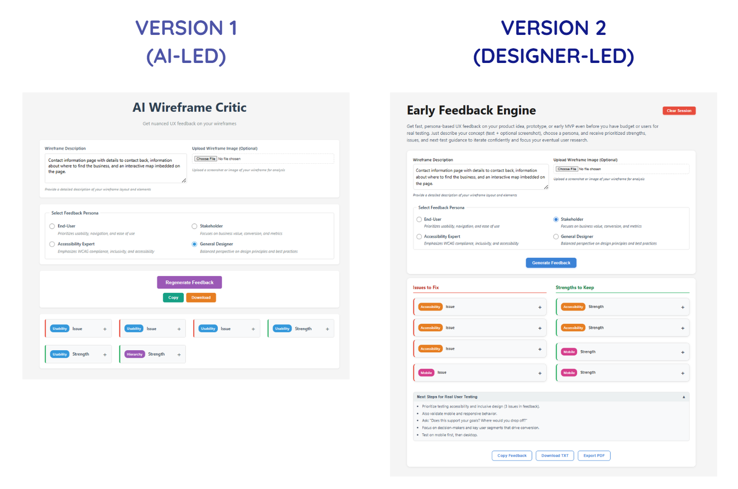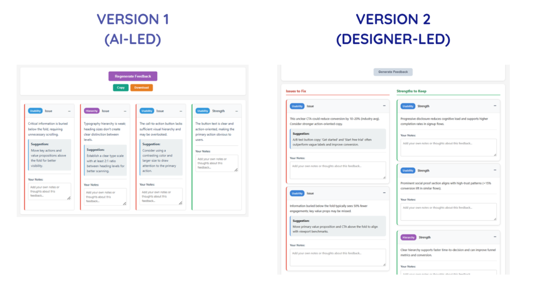 As a result of this key decision, the feedback output transforms from raw data to leverageable next steps for the user, leveling up the product from a generator into a scaffold for iteration.