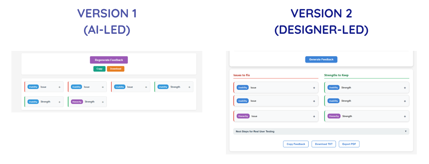 - Reordered information architecture to reflect the user's mental progression (Input → Generate Feedback → Review/Add to Structured Critique → Export Data)
